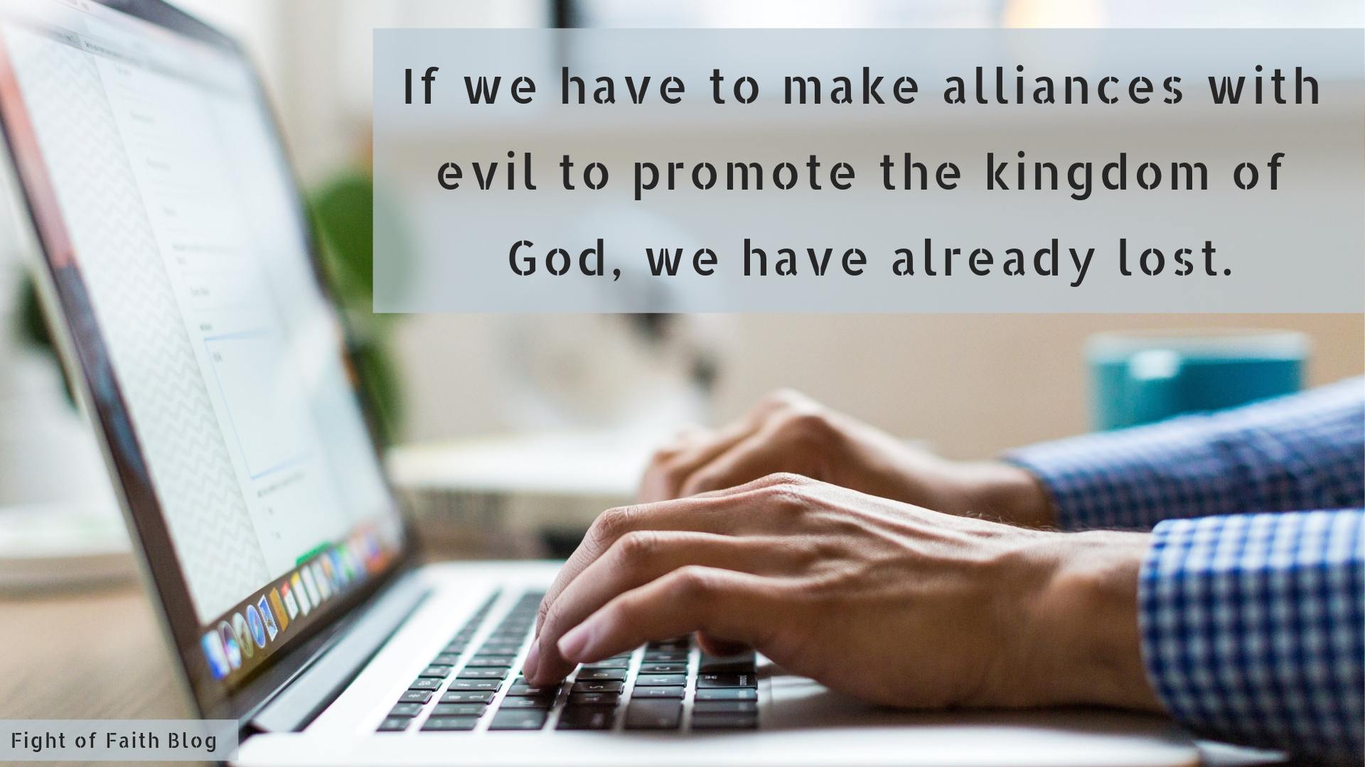 Someone might say, “the opposition is always making up stories and smearing people who hold godly views; it is no big deal if we respond in like manner, this is how our culture communicates. It is a propaganda war and we need to participate in order to have a voice.” The biblical response to that is, if we have to make alliances with evil to promote the kingdom of God, we have already lost.