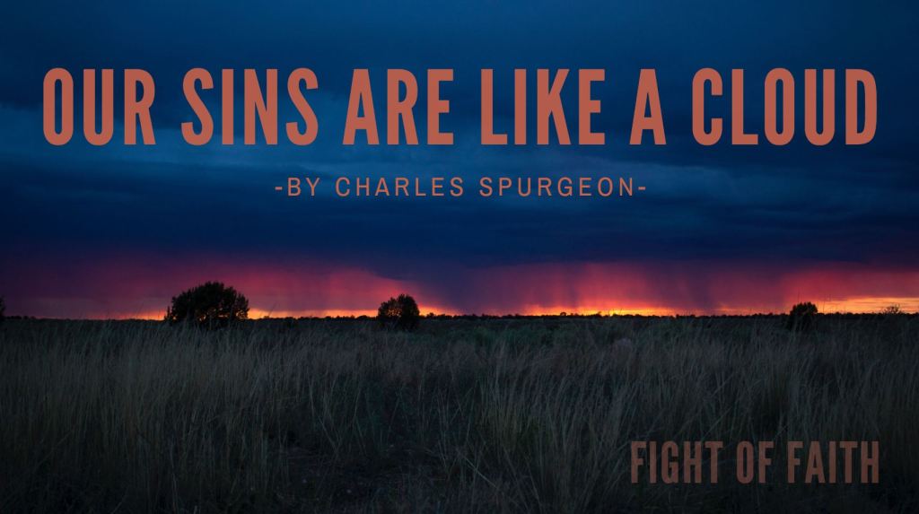 Attentively observe the instructive similitude: our sins are like a cloud. As clouds are of many shapes and shades, so are our transgressions. As clouds obscure the light of the sun, and darken the landscape beneath, so do our sins hide from us the light of Jehovah’s face, and cause us to sit in the shadow of death. They are earth-born things, and rise from the miry places of our nature; and when so collected that their measure is full, they threaten us with storm and tempest. Alas! that, unlike clouds, our sins yield us no genial showers, but rather threaten to deluge us with a fiery flood of destruction. O ye black clouds of sin, how can it be fair weather with our souls while ye remain?