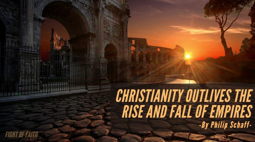 Christianity has thus passed through many stages of its earthly life, and yet has hardly reached the period of full manhood in Christ Jesus. During this long succession of centuries it has outlived the destruction of Jerusalem, the dissolution of the Roman empire, fierce persecutions from without, and heretical corruptions from within, the barbarian invasion, the confusion of the dark ages, the papal tyranny, the shock of infidelity, the ravages of revolution, the attacks of enemies and the errors of friends, the rise and fall of proud kingdoms, empires, and republics, philosophical systems, and social organizations without number. And, behold, it still lives, and lives in greater strength and wider extent than ever; controlling the progress of civilization, and the destinies of the world; marching over the ruins of human wisdom and folly, ever forward and onward; spreading silently its heavenly blessings from generation to generation, and from country to country, to the ends of the earth.