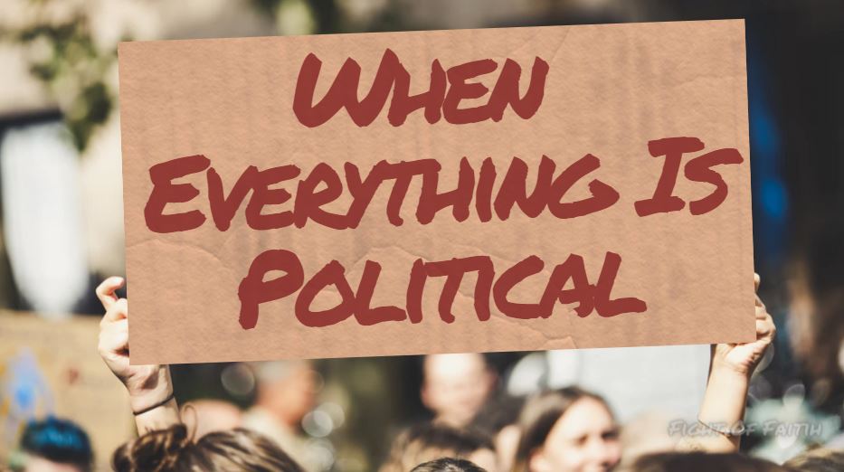 However, this counter-argument is an equivocation of how I have used the term “political” above. It misses my deeper argument. Yes, there is a sense in which everything is political in the true philosophical sense. Everything has political ramifications. A good citizen who desires to love his neighbor will be attuned to this, but a political party is not our god. It should never be the lens through which we evaluate all things. This is the kind of politics I am arguing against. Politics like that has an insatiable appetite. It will consume every aspect of our lives. Instead, as Christians, we are to take every thought captive to the obedience to Christ, not a political party. That is how we make everything spiritual: even politics. The way to promote the greater political good is to live a life where not everything is political.