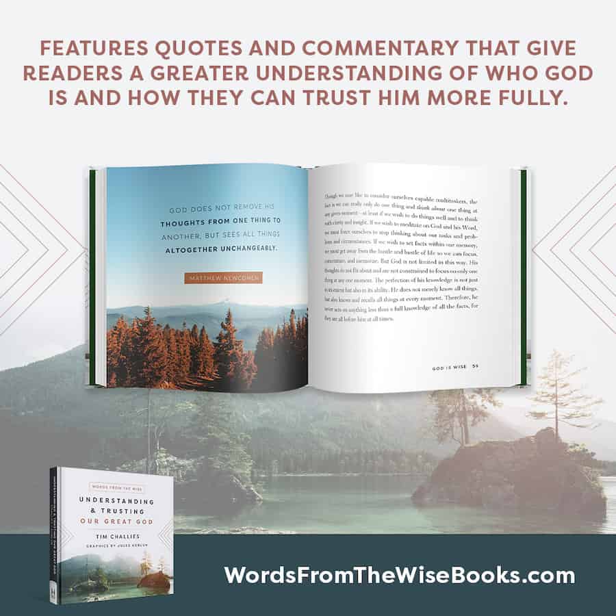 Our need to keep our God before our eyes is why I am grateful for the second book in the Words to the Wise series, Understanding and Trusting Our Great God. Tim Challies has gathered inspiring quotes from great minds such as Jonathan Edwards, A.W. Pink, Jerry Bridges, R.C. Sproul, and Joni Eareckson Tada and arranged them systematically to help us consider our God. Jules Koblun uses her gift to display these words of wisdom beautifully. Each page spread includes a graphically highlighted quote and a short meditation by Tim in which he highlights its truth.
