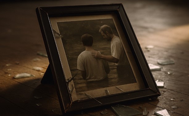 Somewhere along the way, he had been derailed. The glitter of worldly success had caught his eye, and like Demas, he had taken the bait. He bent to pick up the picture. He wiped off the broken glass and took the photo from the frame to look more closely. As he flipped the image over, he noticed something written in his dad’s hand and dated the day of his baptism. It said,