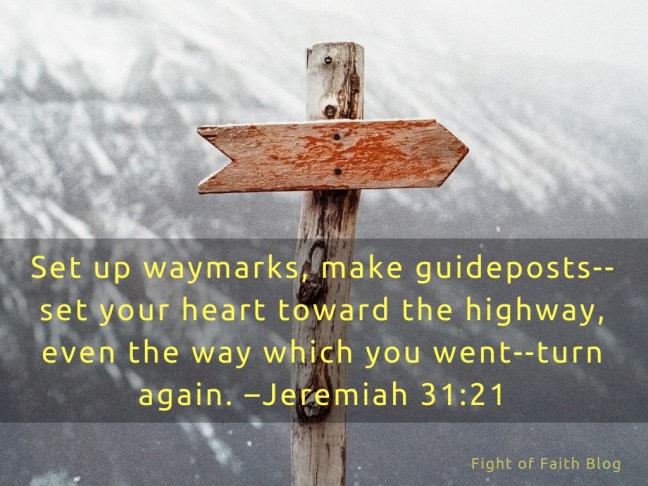 "Set up waymarks, make guideposts--set your heart toward the highway, even the way which you went--turn again, O virgin of Israel, turn again to these your cities." –Jeremiah 31:21 To look at the past is often a blessed encouragement for the future. If we are travelers in the way Zionward, we shall have our various … Continue reading Set Up Waymarks